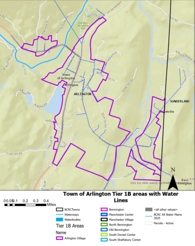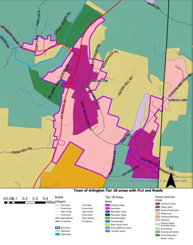 a. Nick presented the BCRC’s new definition for “Tier 1B” area development in response to legislature’s passing of Act 181, to encourage more housing near village centers. The area to be defined Tier 1B for Arlington is provided on pages 2-3 of these minutes. The first image shows the proposed Tier 1B area with water supply lines. This image shows a considerably expanded town center than the current town center. The second image shows more detail of where housing, up to 6-10 units per 2 acre lot, could be placed, provided there is adequate water and sewage. Some areas are exempt because they are located in the state-designated River Corridor. The Town can choose to apply additional conditions, which may be considered in the upcoming rewrite of the Town Plan. The town is not required to apply for Tier 1B status, but there are clear benefits to considering an application, notably exemptions from Act 250.
